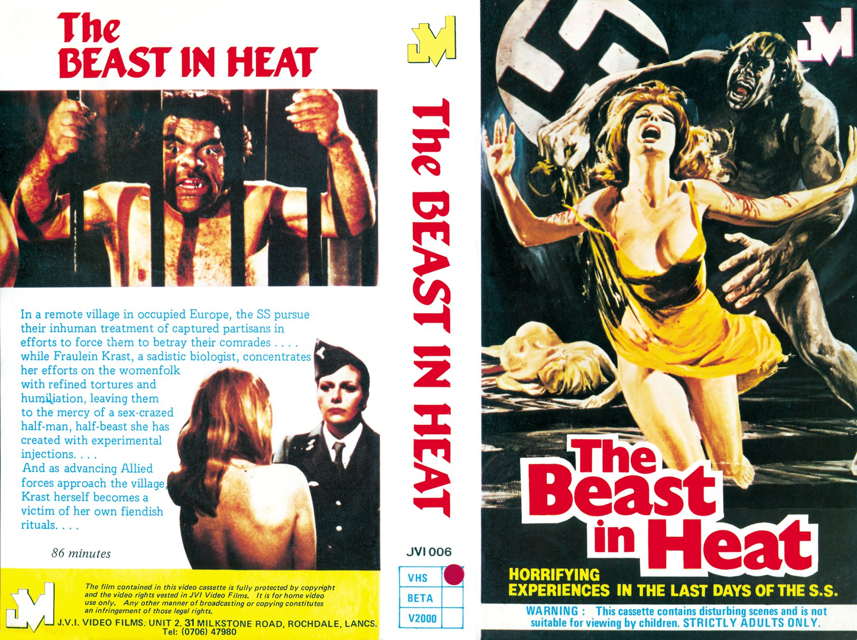 Female SS officer and twisted doctor, SS Kratsch (what a great name for an evil character) has developed a genetically engineered half-man, half-maniac (think a cross between Ralphus from Bloodsucking Freaks and the real-life serial killer Fred West) who is fed a diet of ‘mega-aphrodisiacs’ which meets that his libido is through the roof and he’s ready to both kill and…well, you can guess the rest (*waves to the Community Standards team*)