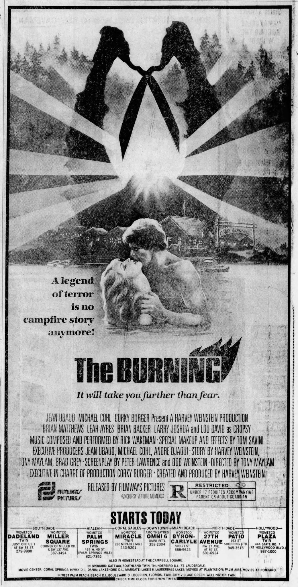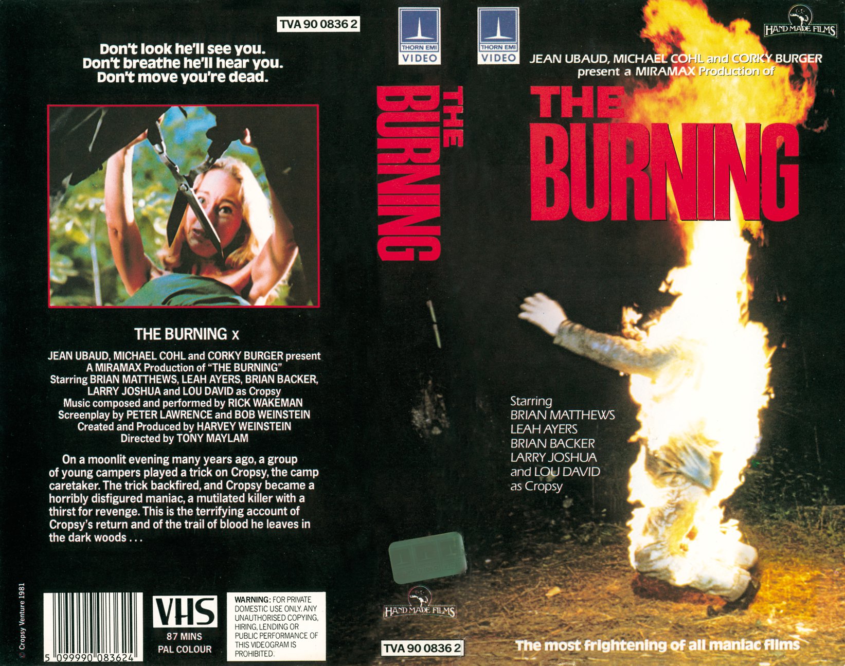 The Burning is a treat to behold. Great cinematography and directorial touches (check out Glazer’s death and the killer’s/shear’s point of view shot) and a great music score by none other than prog rock’s very own Grand Wizard Rick Wakeman (apparently on his ’81 tour he was playing tracks from The Burning soundtrack. Whilst possibly wearing a cape). The teen characters are quite likeable too which is a real rarity for the slasher genre.