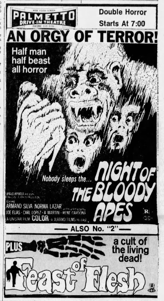 Night of the Bloody Apes ia a 1969 Mexican horror film directed by Rene Cardona and Jerald Intrator. A doctor transplants a gorilla’s heart into his son’s body to try and cure his lukemia. This turns the son into a murderous and very nubile half-man, half-ape type hybrid who wreaks havoc.