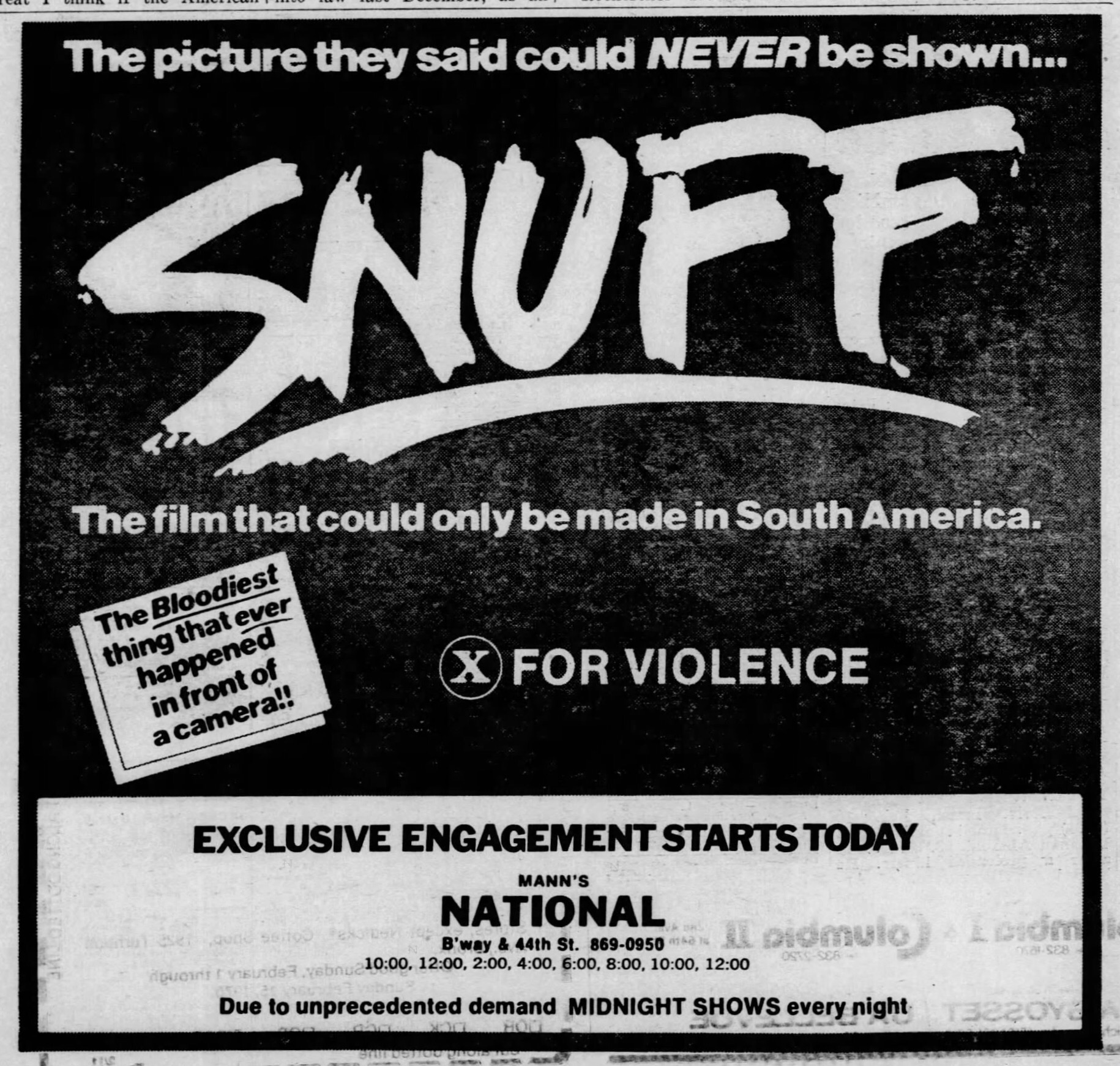 Snuff was released to an unsuspecting public in 1976 and caused controversy right from the get-go. A producer who was distributing the film under it’s original title of Slaughter had read about ‘snuff’ movies which were rumoured to being made in South America. Hence, to capitalise on this (!) he had a new ending shot for the film which implied that we were actually seeing someone being killed on screen. An investigation was launched to establish whether this sequence was real or not.