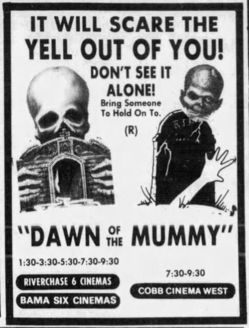 I can still remember seeing the artwork for this movie on the video shelves of my local video shops back in the day. This film was unbelievably involved in the Video Nasties furore as it was a movie on the third list which involved films that video dealers couldn’t be prosecuted over but which could be confiscated at any time still. It was in good company as the first two Friday the 13th films and The Hills Have Eyes were also on this third list. It’s unthinkable that such a cheesy film as Dawn of the Mummy was thought to be potentially able to bring about the end of civilisation as we know it. But that was the hysteria of the era.