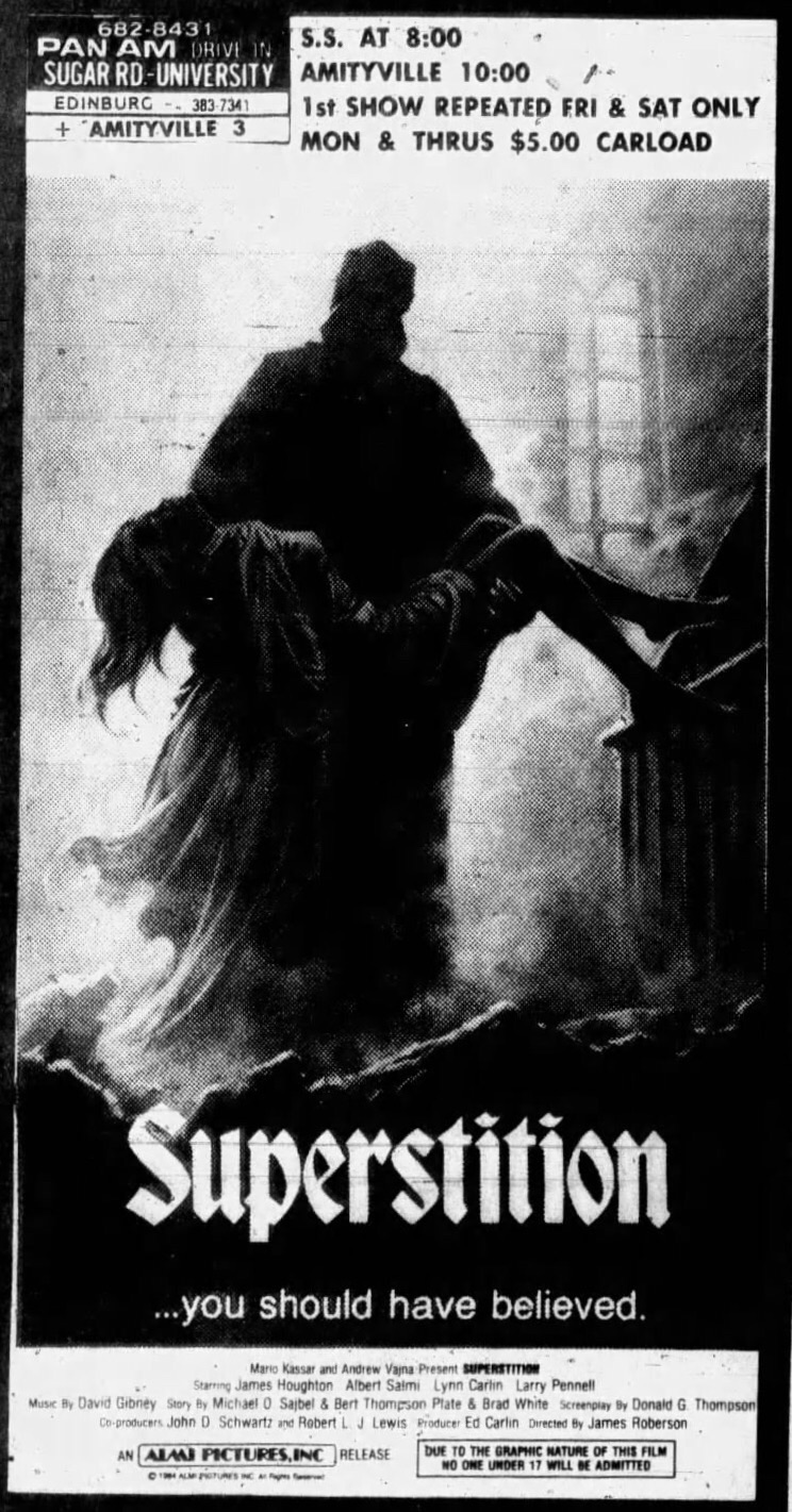 Superstition boasts impressive kills (the ones involving the circular saw and severed head in the microwave are doozies!) and a great turn by the witch who *is*actually a witch and not an innocent woman who has been wronged. Her pulsating forehead demonstrates that she’s a witch and it’s one hell of a party turn.