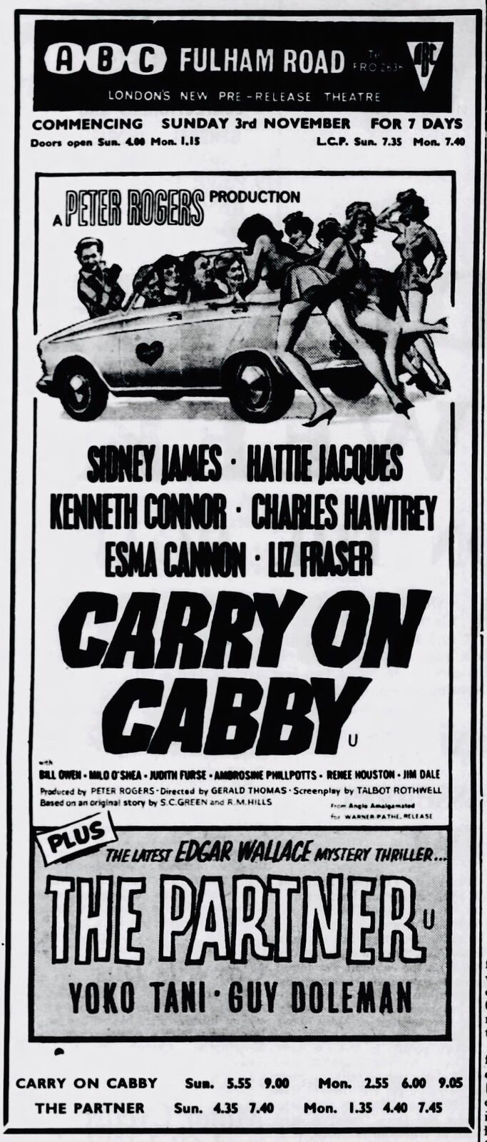 My first surprise on watching Carry On Cabby was that it was shot in black and white whilst the previous film was in colour. On further investigation, I found out that it was only halfway through production that the film (originally called Call Me A Cab) was suddenly turned into a Carry On film.