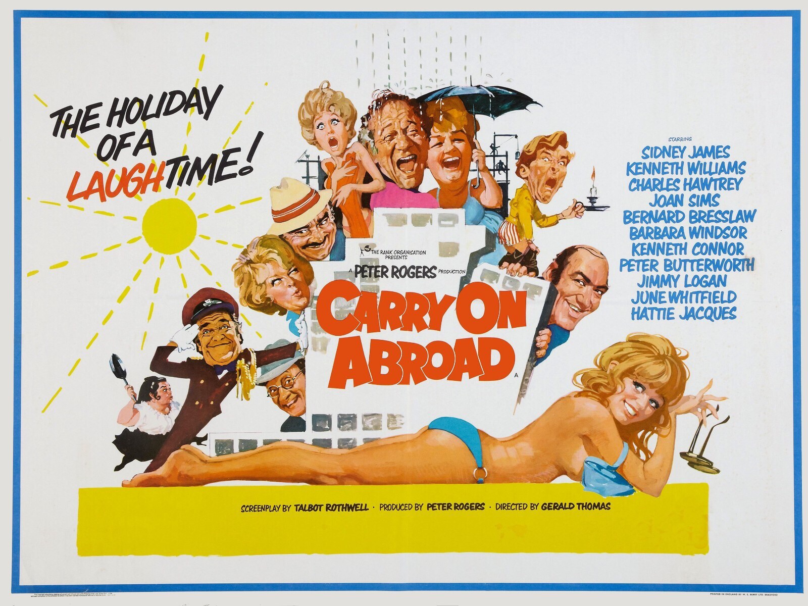 Stuart Farquhar (Kenneth Williams) is the travel rep who is accompanying holidaymakers to the Mediterranean island of Elsbels. The travellers are an eclectic bunch and include pub owners Vic and Cora Flange (!), the amorous Stanley Blunt and his bossy ice maiden of a wife, Evelyn, Mummy’s boy Eustace Tuttle and monk Brother Bernard.
