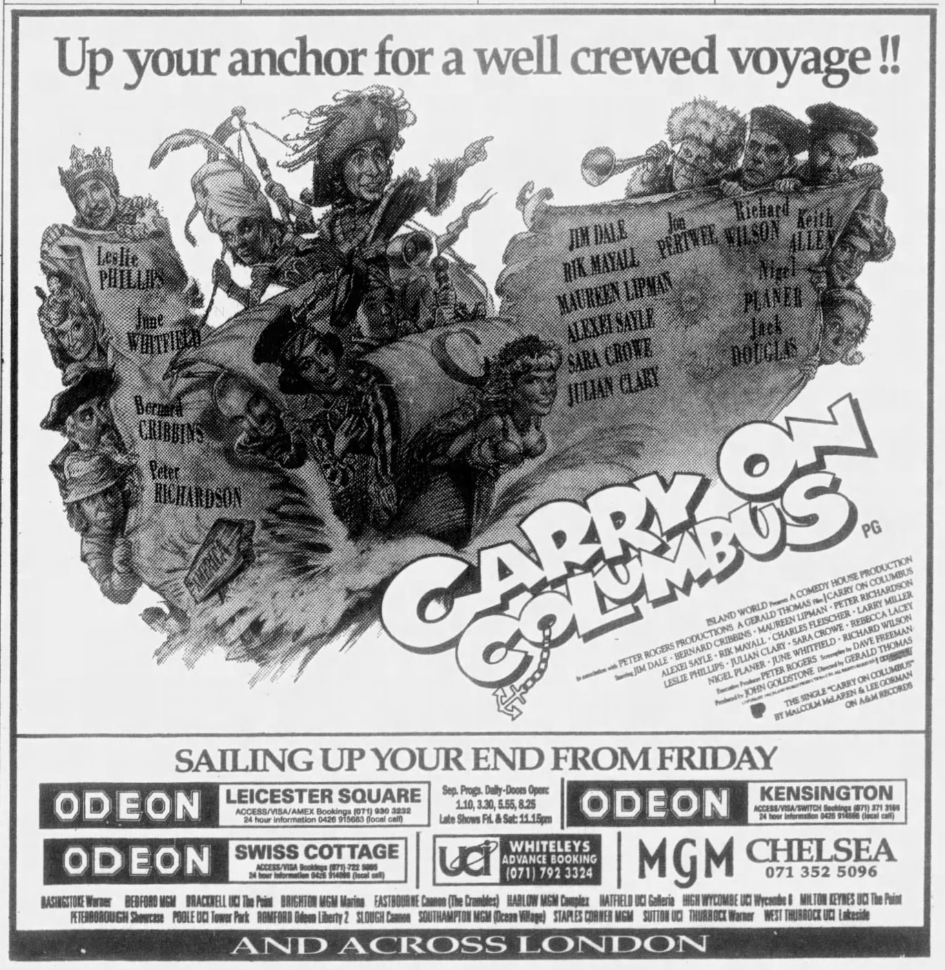 Carry On Columbus was made 14 years after the last entry (Emmannuelle) and features actors who had previously starred in films within the series (including Jim Dale, Bernard Cribbins and June Whitfield) whilst it also boasted newer additions who were stars in their own right (including Rik Mayall, Julian Clary and Maureen Lipman).