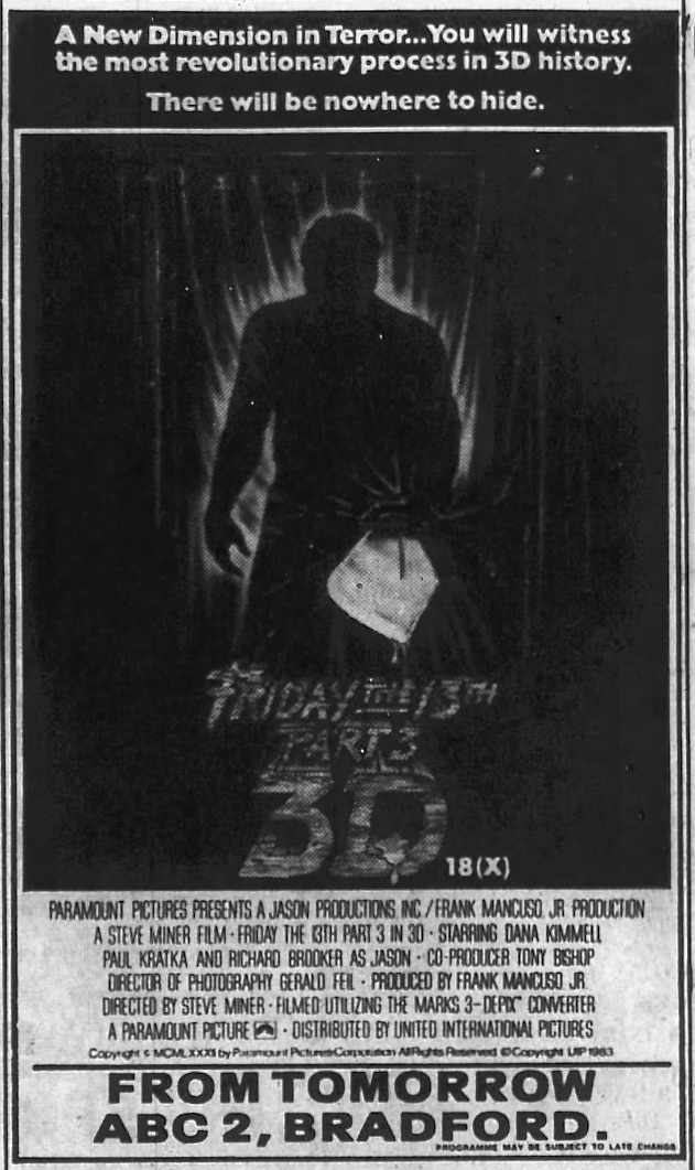 And that’s just what happened. The films were classified, with 3 seconds being cut from Part 3 (Part 4 would be cut a lot more heavily). So, thats the version I saw- 2D, pan and scan on home video in 1987.